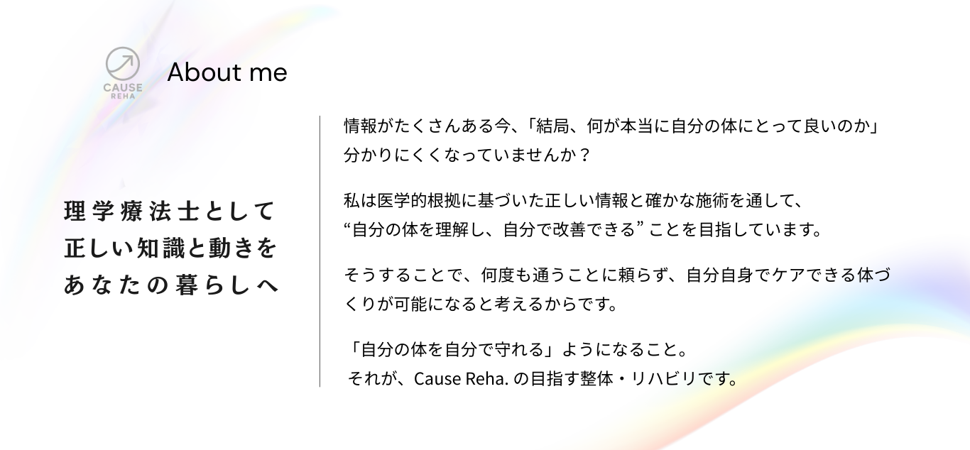 3回のリハビリ中に改善の兆候を自覚でき、セルフトレーニングまでをしっかりとサポートすることでリハビリを卒業できることを目指します。 |